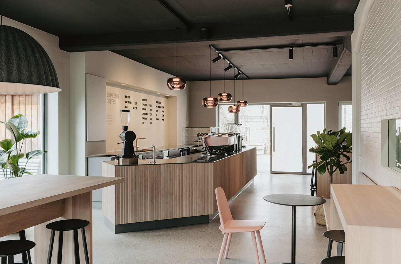 Entering the new Supremo Kaffeerösterei in Unterhaching, a suburb of Munich, Germany, one senses an instant change in pace and the wonderful smell of great coffee. As natural light shines through from the outside and highlights the natural colours and subtle textures of the carefully selected materials, the newly designed commercial space feels warm and welcoming.